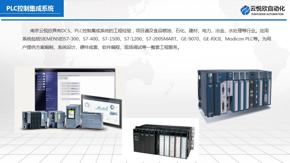 南京云悅欣自動化工程有限公司有從事DCS、PLC控制系統(tǒng)集成的工程經(jīng)驗,項目可遍及石化。建材。電力、冶金、水處理等行業(yè)。應(yīng)用的系統(tǒng)包括ABB的Frelance2000 、SIMENS-S7-300、400、GE-9070、Modicon PLC等??蔀橛脩籼峁┓桨妇幹啤⑾到y(tǒng)設(shè)計、硬件成套、軟件編程、現(xiàn)場調(diào)試等一整套工程服務(wù)。